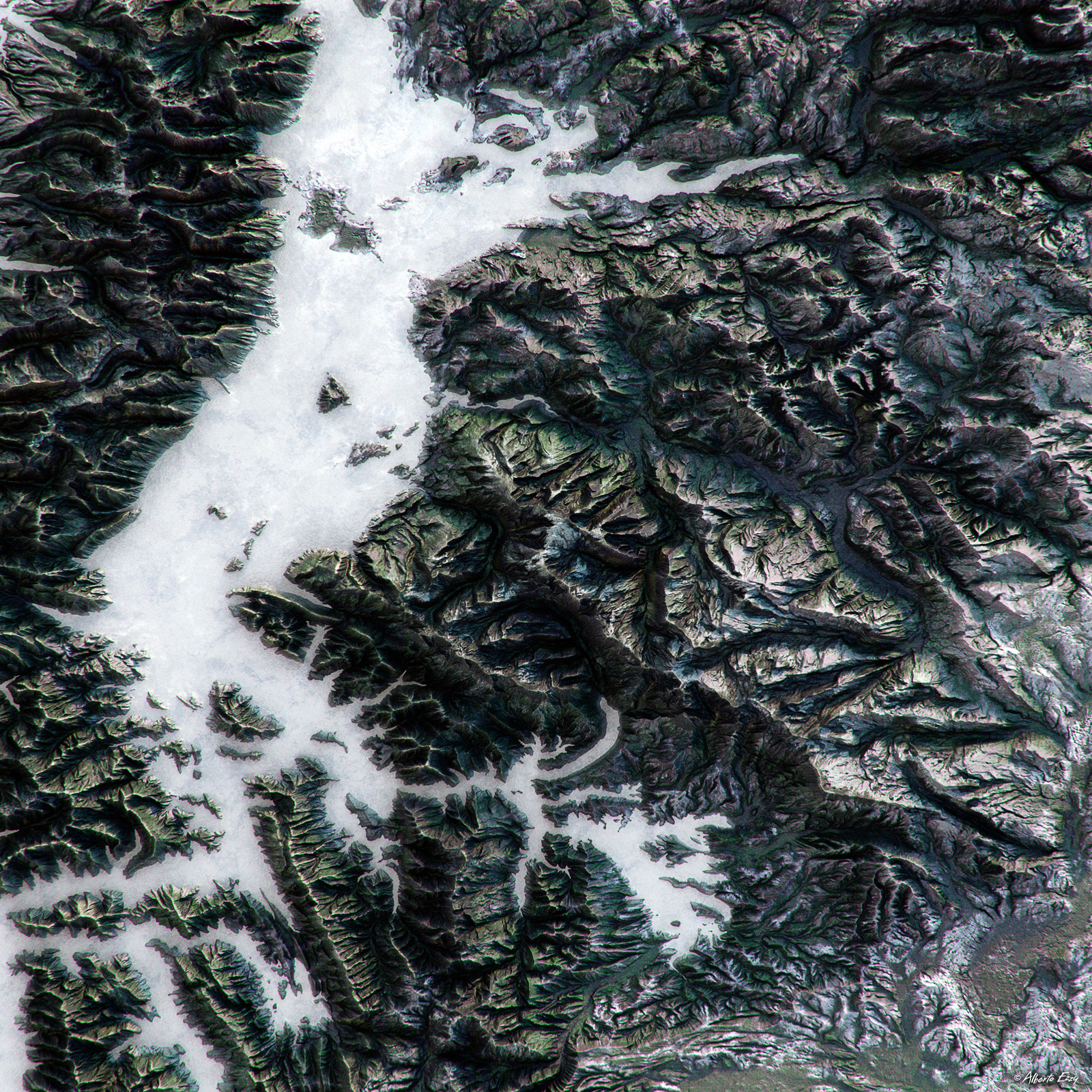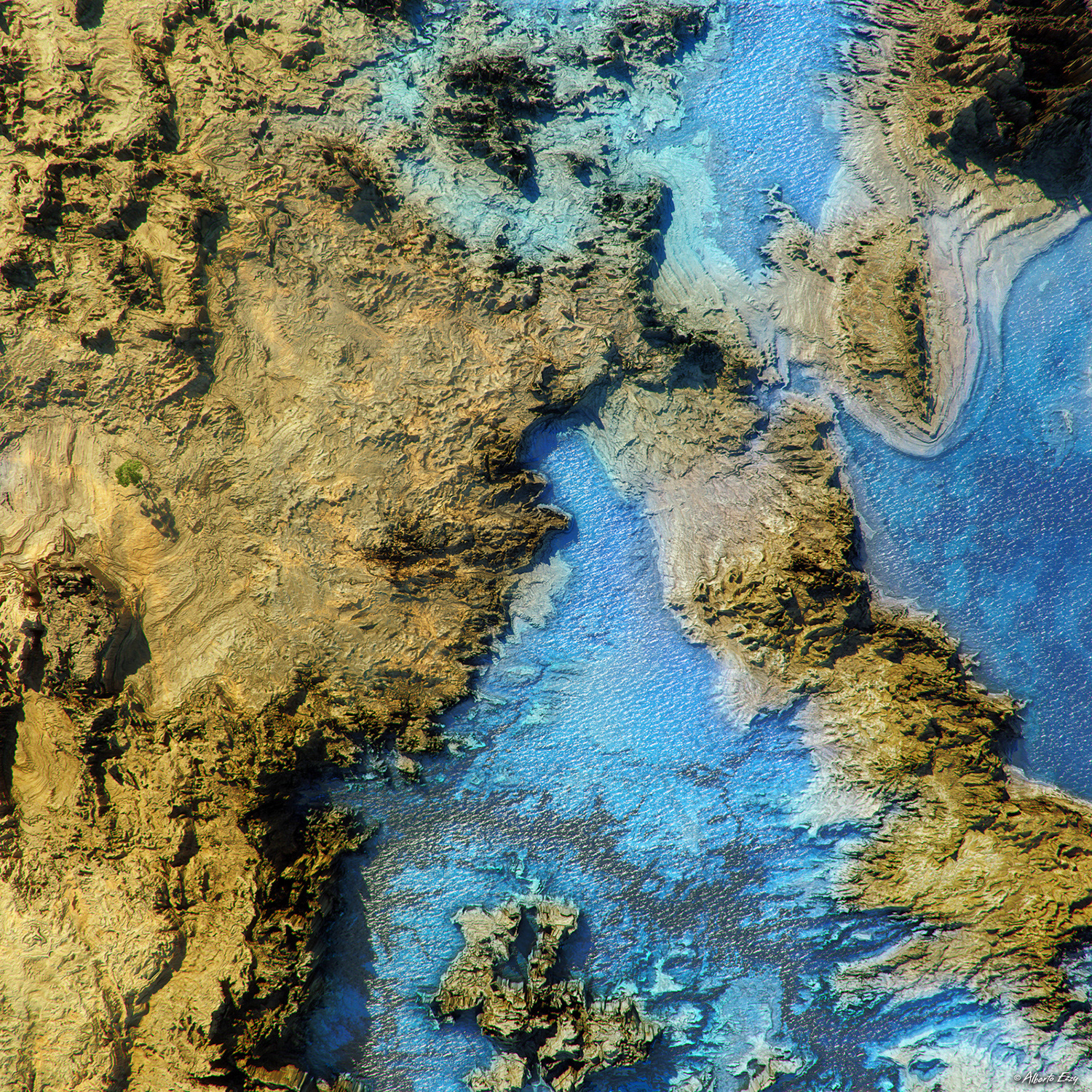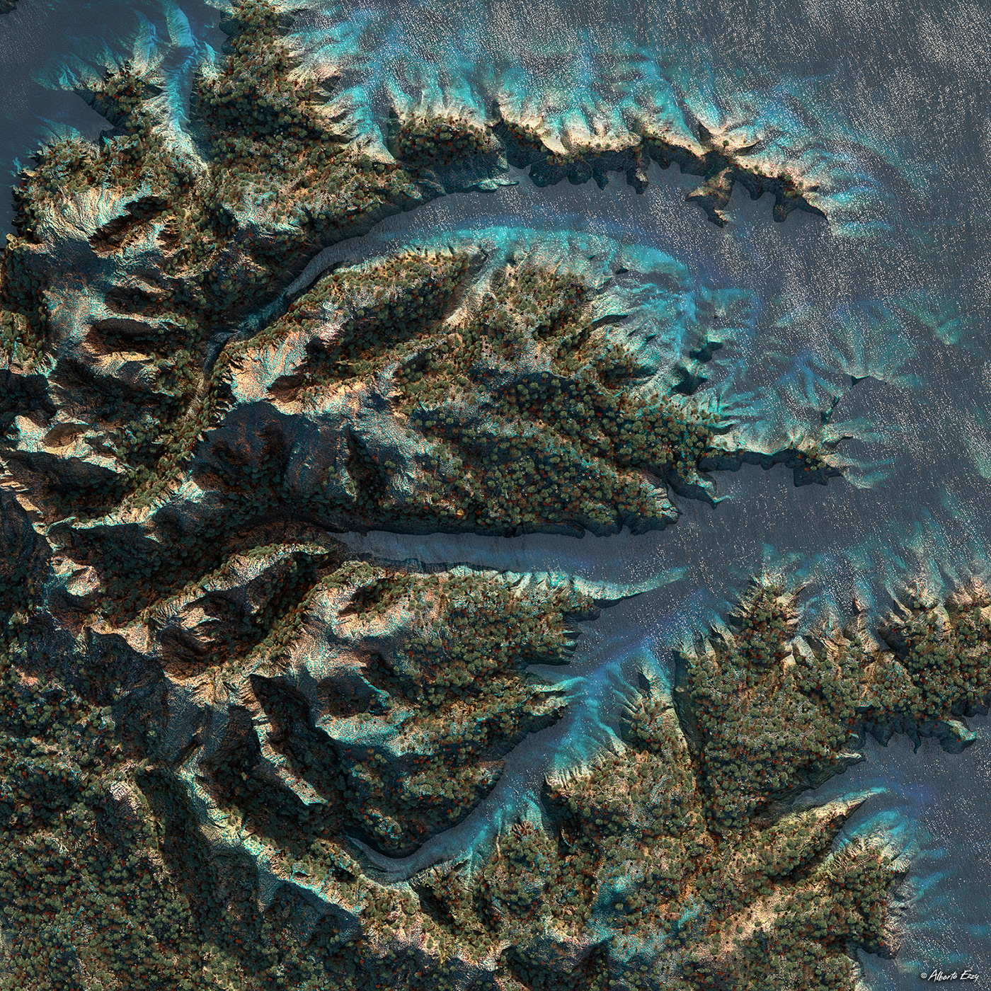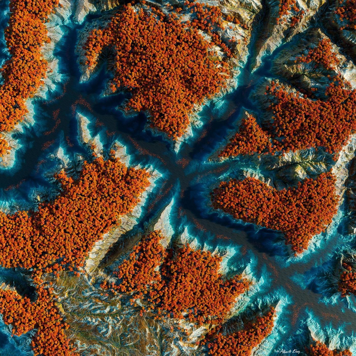 I really love aerial photography and 3D displaced terrains, so I decided to combine them into these aerial shots of 3D terrains based on realworld elevation data.