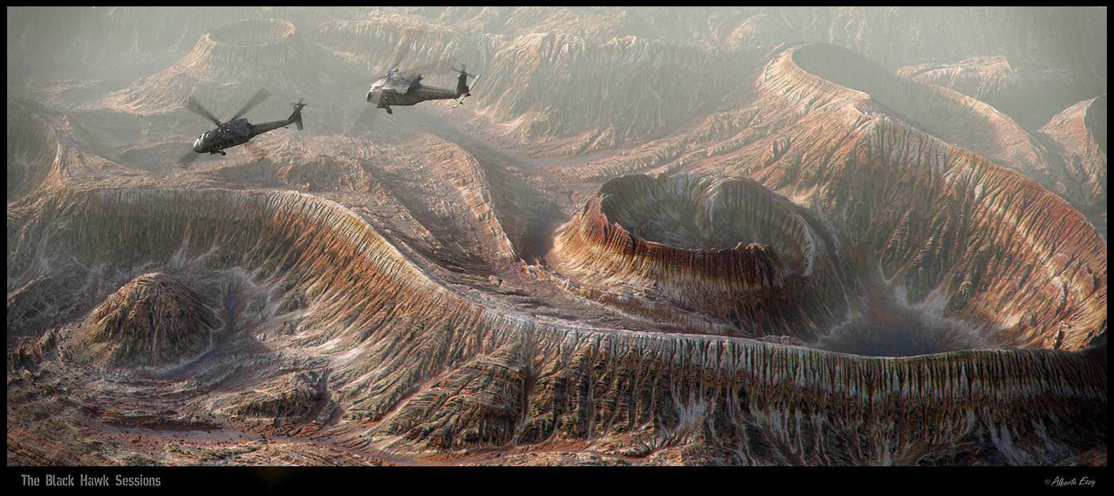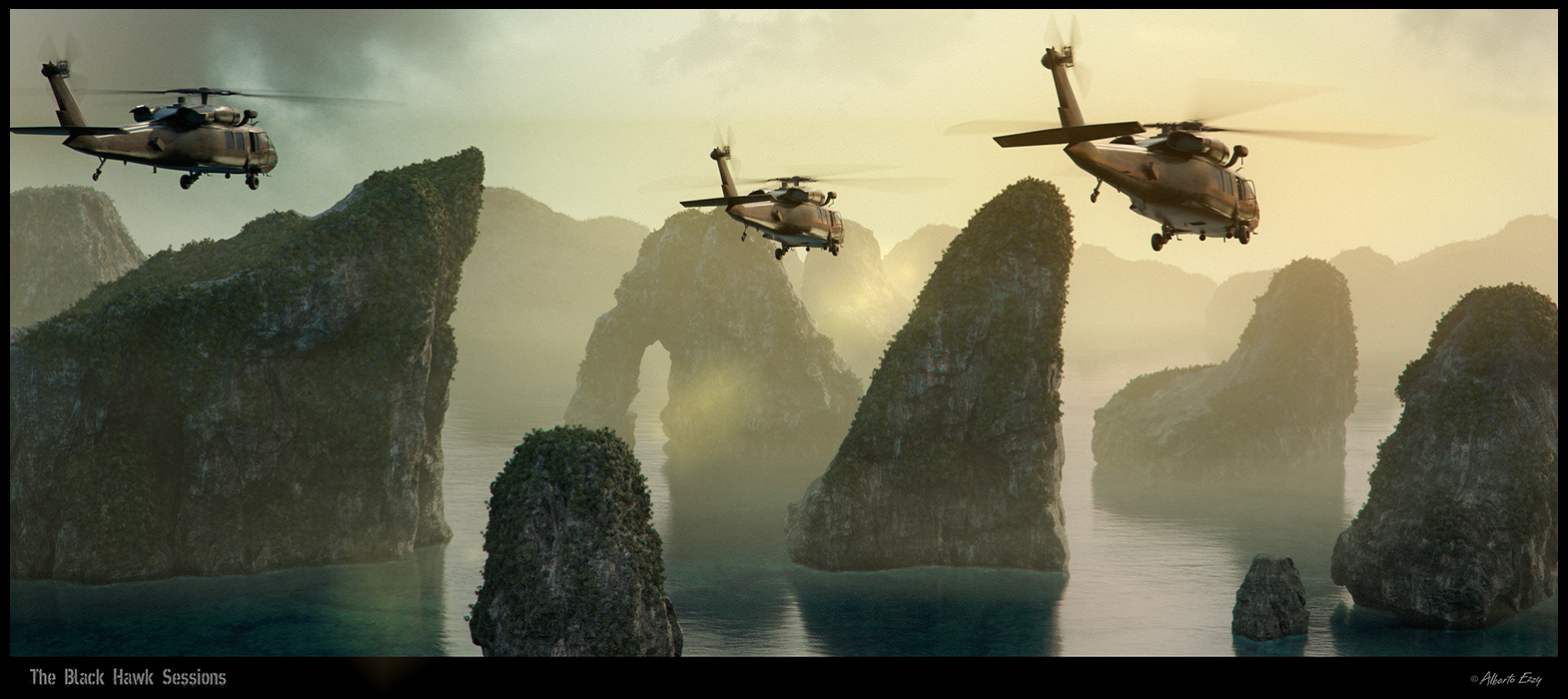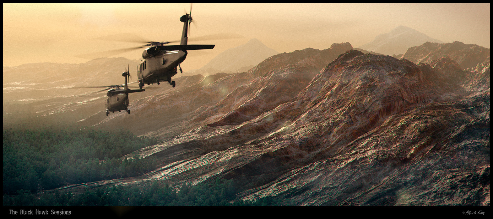 A series of Black Hawk themed shots to showcase new 3D landscapes and environments.